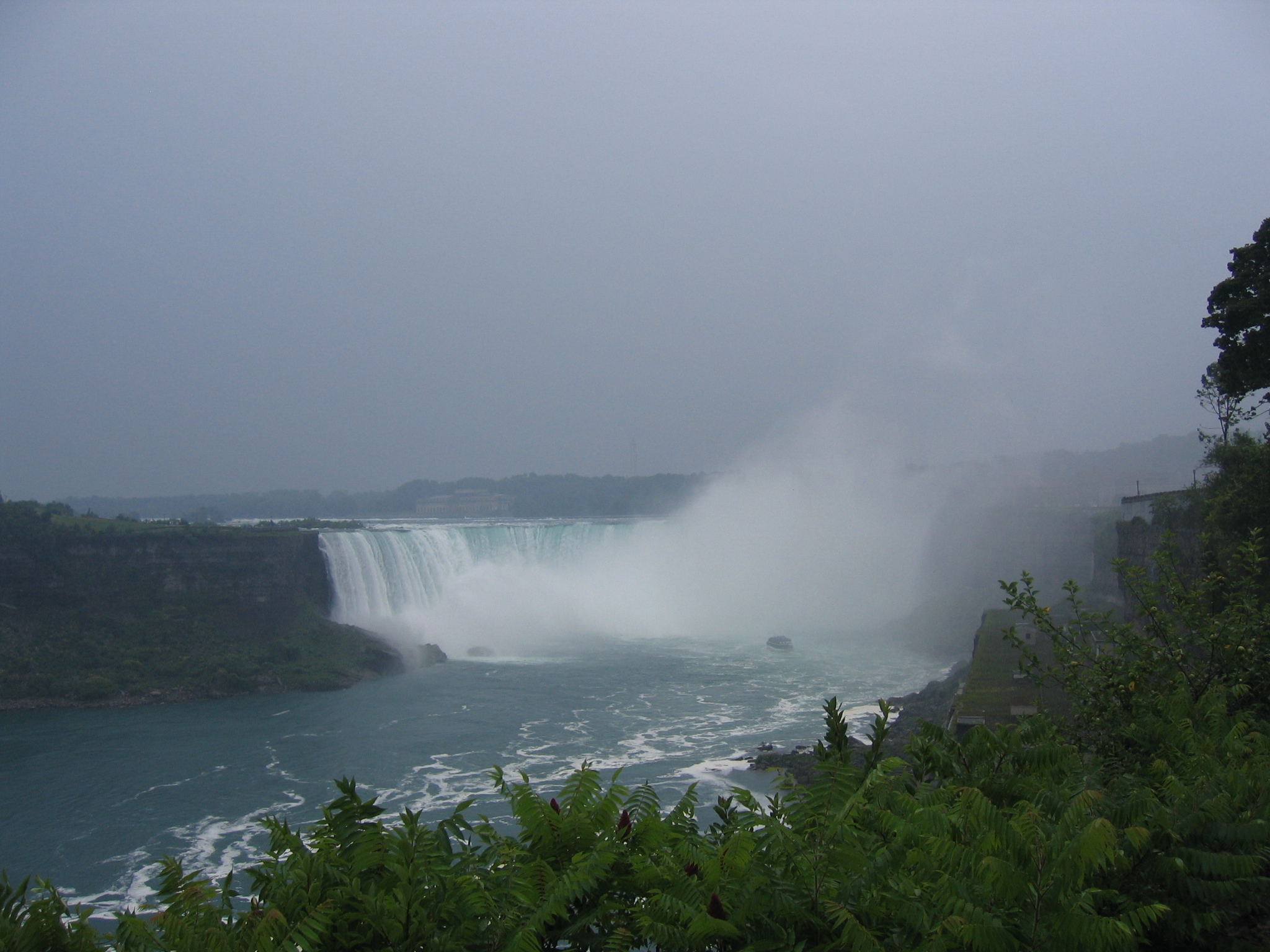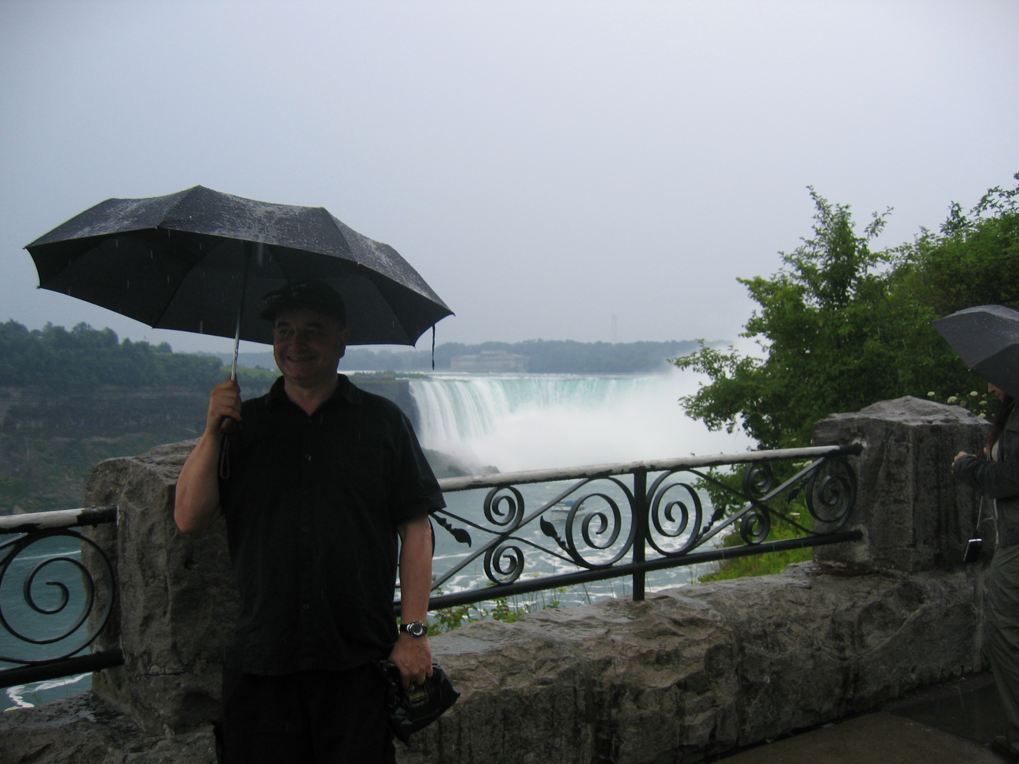We got here at about 5:30 am – plane to Paris leaves at 10:40 – still it’s a very nice airport. Anyway, from Peterborough we had to drive to a donut shop near Niagara falls as Simon was meeting a friend there and leaving us. So we had an interesting drive through the middle of Toronto’s motorway system and a coffee and sandwich at the donut shop, then Pauline and I thought we’d better see the Falls as we were passing right by there. Well the Canadian side of the town is like a very tacky version of Queenstown, with casinos, tattoo parlours, and gazillions of tourists. Funnily enough the US side is a national park and not tacky at all. However, we braved the sudden thunderstorm, (we’d been having thunderstorms most afternoons, and believe me driving on the freeway in the middle of one can be a bit hairy,) and walked to the best viewing spot. You can hear the thunder of the falls way before you see them, and they are quite spectacular alright. I’m glad we went as it’s something I’ve heard about all my life, although I agree with Pauline that I wouldn’t go out of my way to see them again. You can get a boat from the US side, and the boat goes right into the spray at the bottom, I imagine it would be quite something. You can see the boat in one of the pictures: