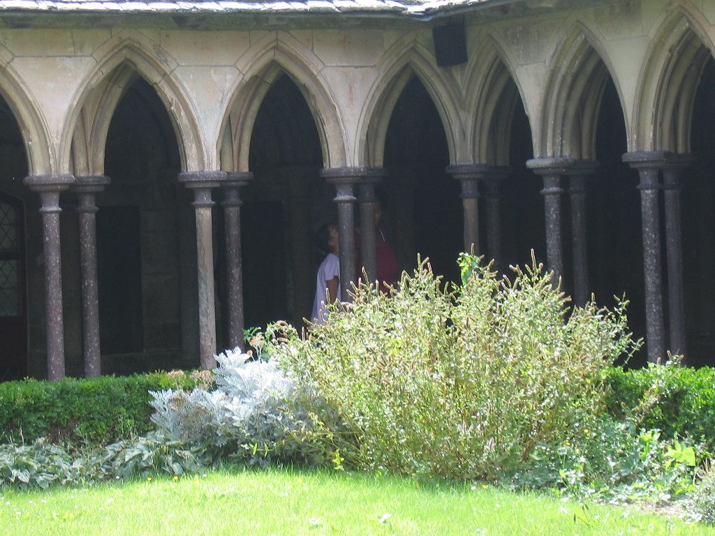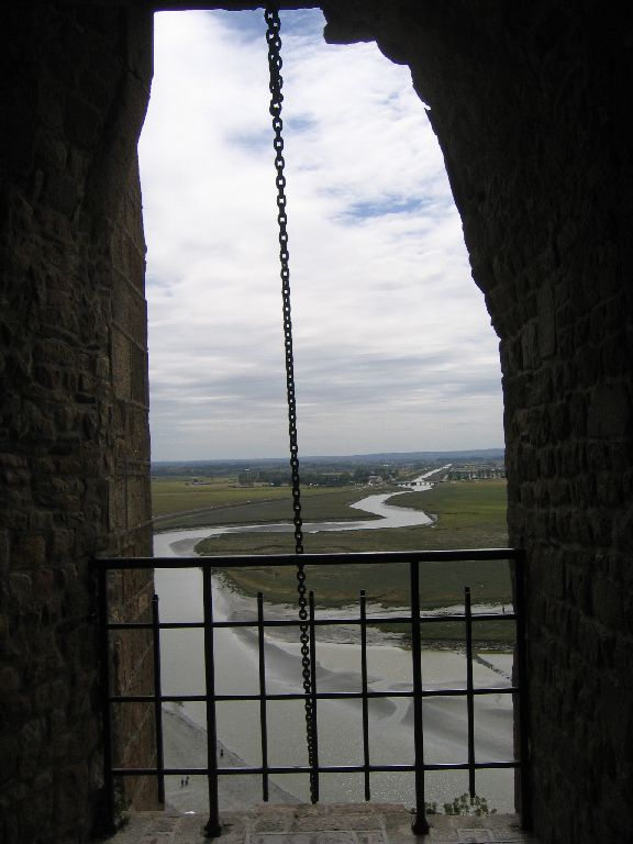 It’s quite good fun though and the buildings themselves are charming. There is a little church halfway up with a cemetary. Apart from the monks in the abby, there are about 50 people living in the town itself. We gradually made our way up the spiral, stopping to look at postcards etc, and to have a sandwich sitting on the steps near the town church. Then we entered the abbey itself, hiring english language electronic guides. The views from the top were most impressive, although Normandy is very flat as you can see from one of the pictures. Inside the construction consists mainly of romanesque arches on top of massive pillars and characteristically thick walls, presumably why the structure has lasted such a long time. It was interesting to see the places where monks have lived and slept and cooked and prayed for over 1000 years. It is an exceptional place to visit.
