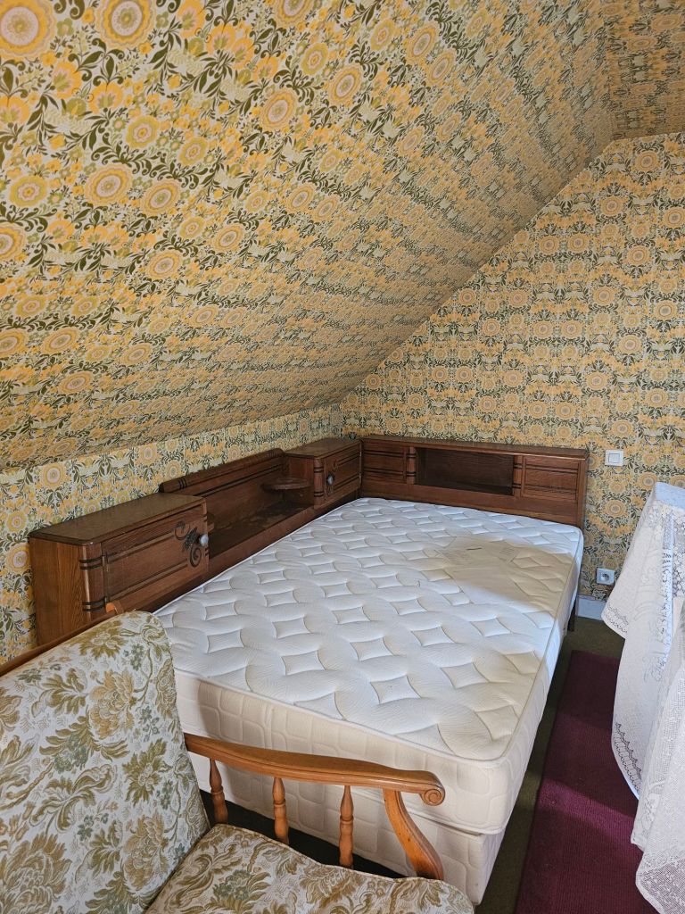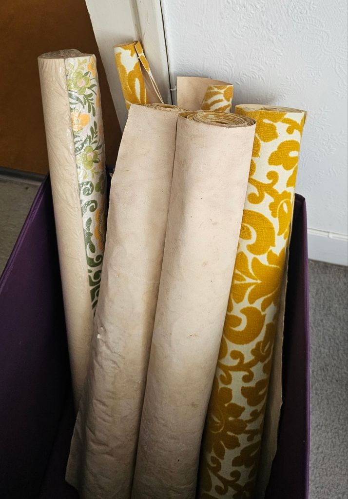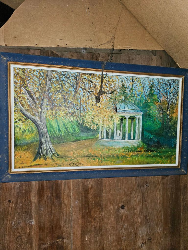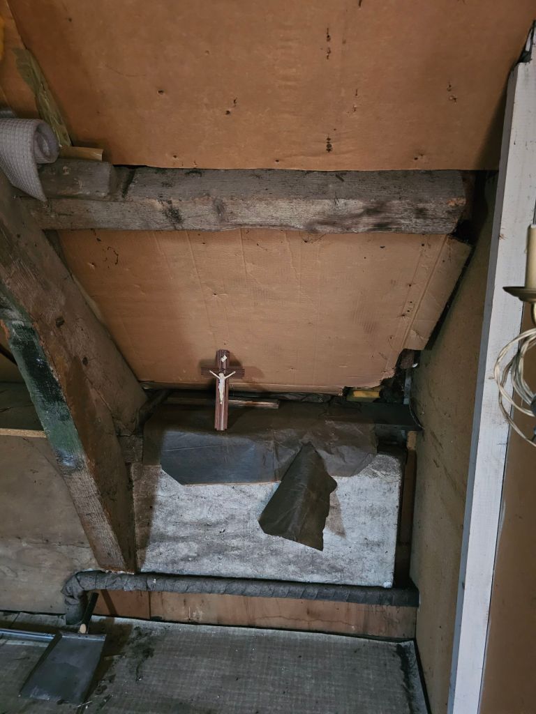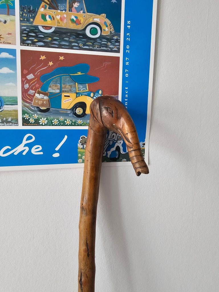 I always wondered how they got this enormous armoire in the attic because it definitely wouldn’t fit up the stairs. It turns out it’s a sort of flat pack, you can disassemble them.The other room in the attic is fitted out, even has wallpaper on the ceiling!I suspect M. Joulain may have been a catholic. There were a lot of Jesus’s everywhere, even in his workshop.Pauline found this very nice stick in the attic, must have belonged to Monsieur Joulain the previous owner.This is a painting of somewhere quite near here. The ladies at the red cross were delighted with it.Pauline says we have to keep this one for the meantime, fair enough.Inside the armoire there was a brand new roll of the same carpet we have in our bedroom, and spare rolls of wallpaper including our lounge wallpaper which Pauline is very excited about, and the attic wallpaper which I’m quite fond of myself!The lounge