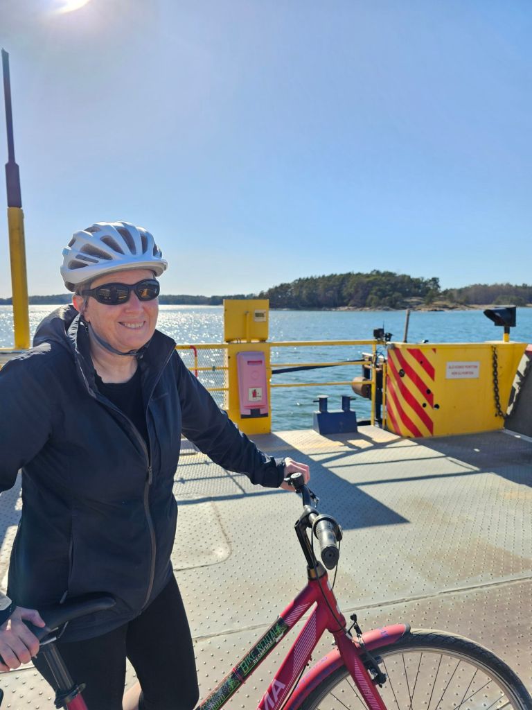 The grounds of the hotelWe had dinner outside. We were the only people staying at the hotel, we felt a bit bad about it really but it was very nice. The book Pauline is reading is a history of the building and how they converted it. They really built this to last. The cows had to be kept warm in the winter.To get from one island to the next in the archipelago they have these free ferrys.The ferry is electric, pulls itself across by cable.We rode these bikes about 35 kms on dusty roads with a bit of a climb occasionally. I was quite happy when we got off them! But they did the job.