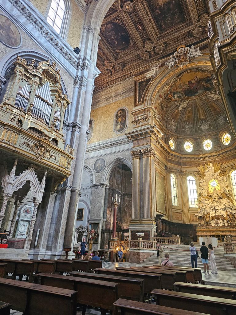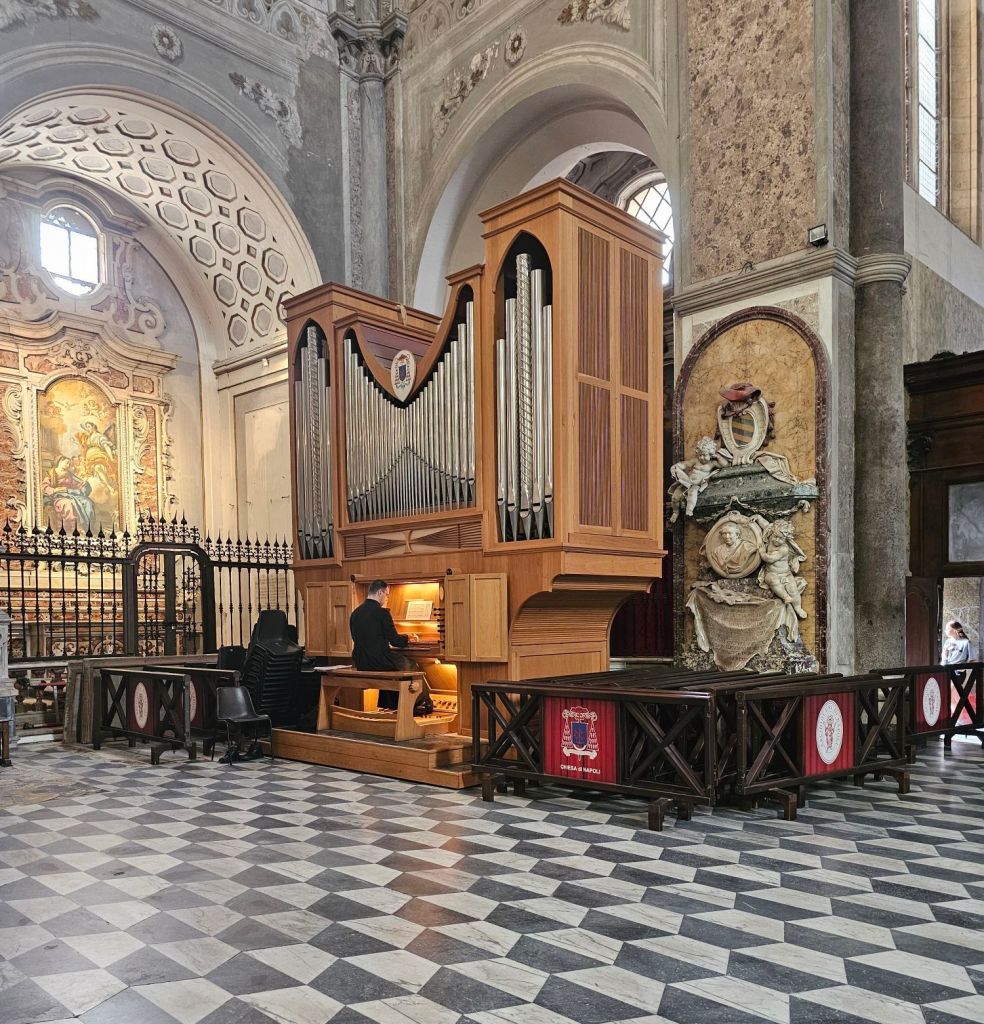 The streets of Naples. Often very narrow but lively.Lots of scooters everywhere. And fascinating courtyards.The Seven Works of Mercy by Caravaggio at Pio Monte della Misericordia.Just across the road from the Pia Monte della Misericordia is the Naples Duomo.In the Duomo, this priest was playing some delightful organ music while we were here. This is the smaller of the two organs.The larger.It’s a beautiful church.