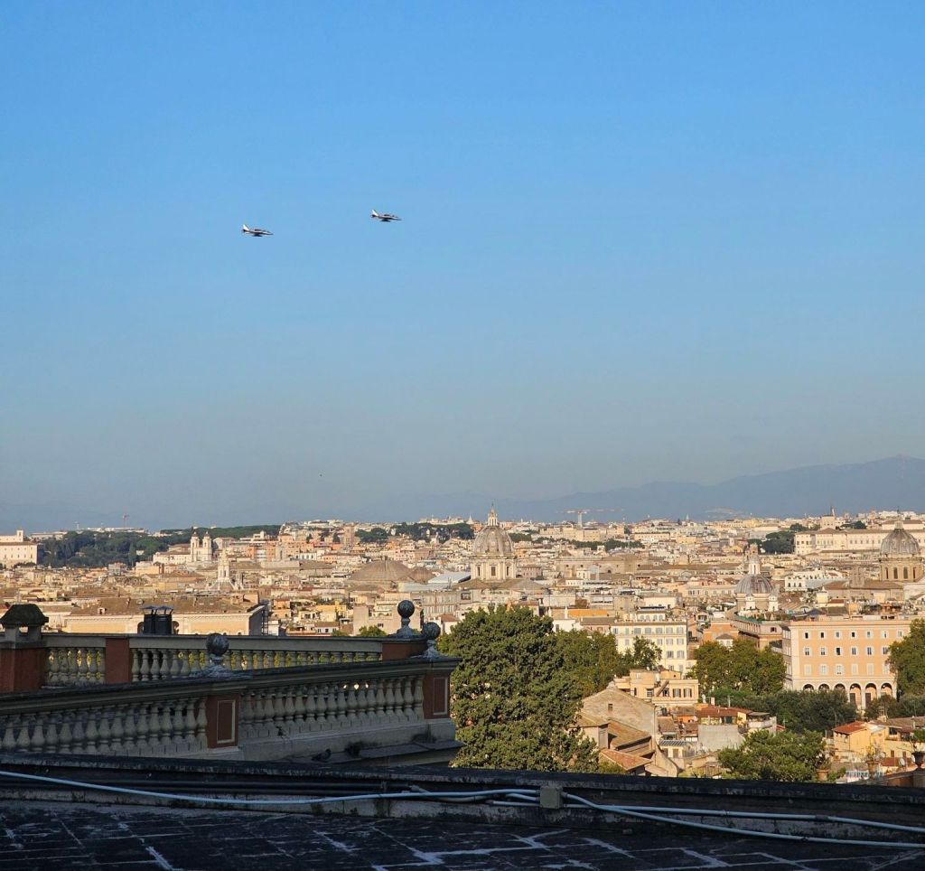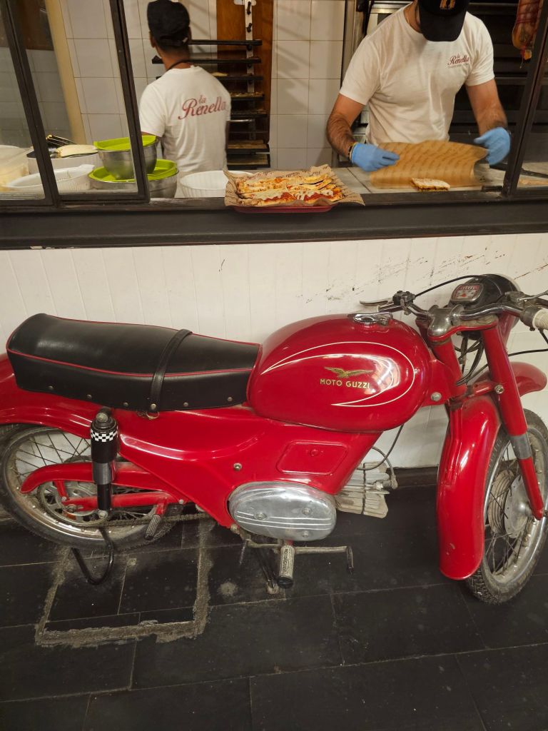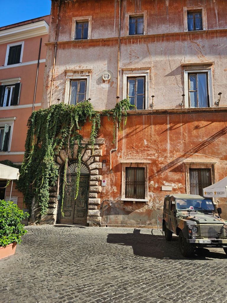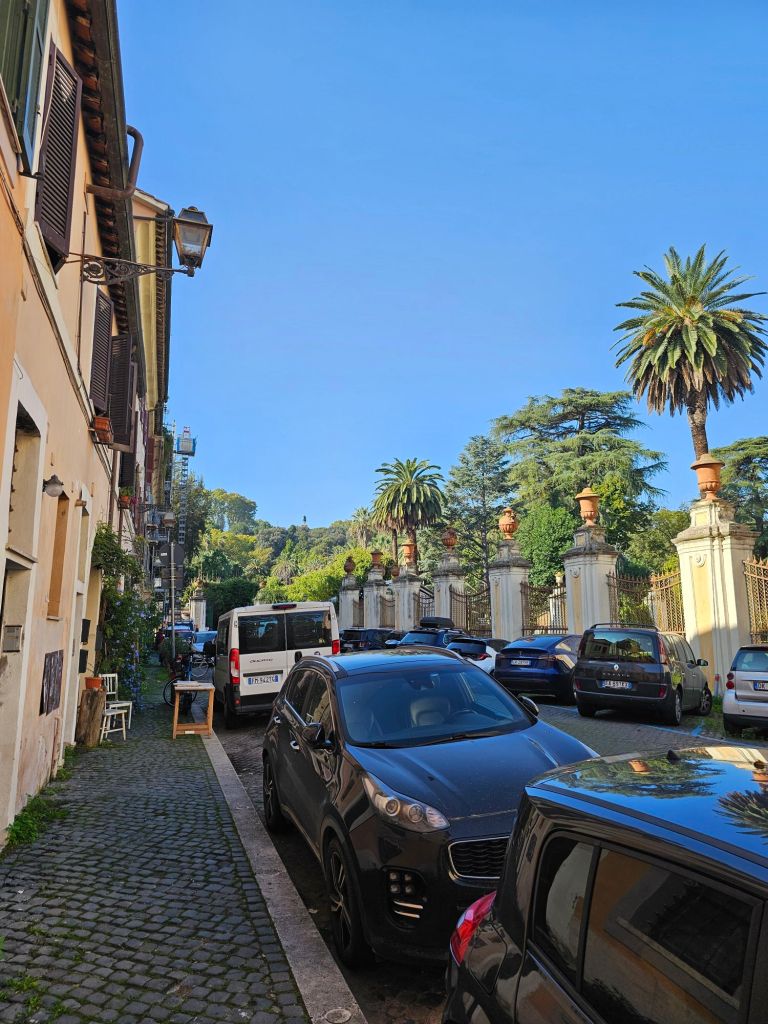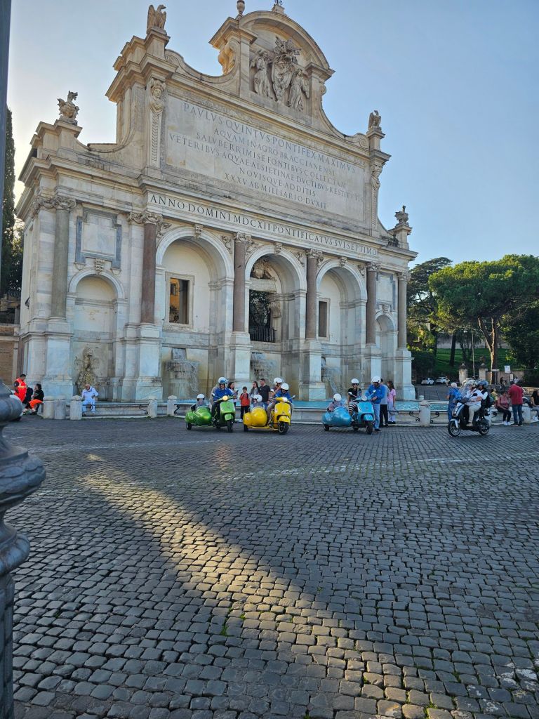 Trastevere. There was a lot of Italian army everywhere we went in Rome. Often with land-rovers.Cafes everywhere. This was our street. Botanical gardens at the end, there were green parrots in the trees. Not native.I liked this local bakery. Not just because of the Moto Guzzi!Since it was Halloween I bought us a couple of these biscuits. The streets were quite narrow and colorful. I liked this trike parked up outside someone’s house.The parking was innovative. We went to see the Pantheon. Very popular with tourists.Pantheon.I walked up the hill behind us as it had this nice fountain thingy and also a panoramic view of Rome. The vespa sidecar tourists just happened to turn up.As did the Italian airforce. I think they were practicing for a display.View from the fountain with added jets.