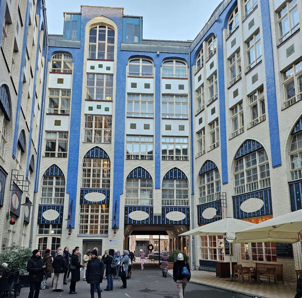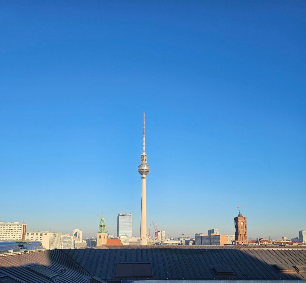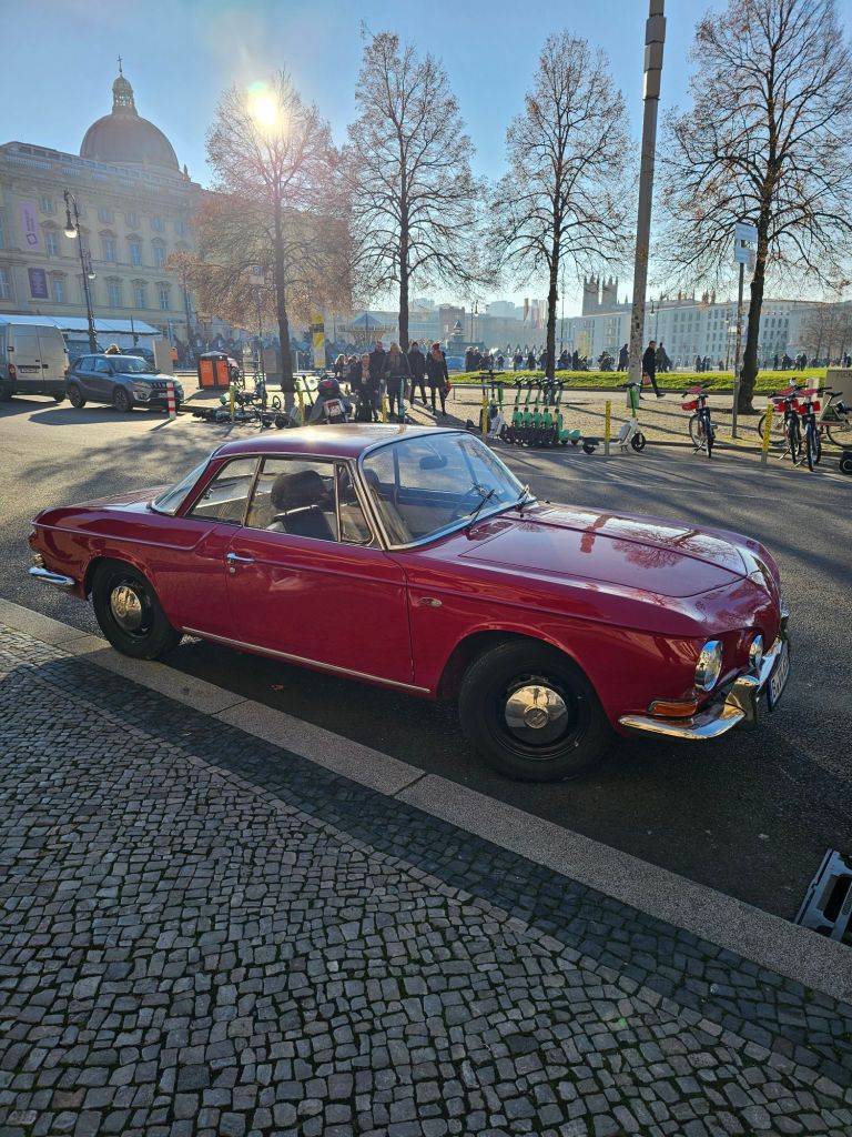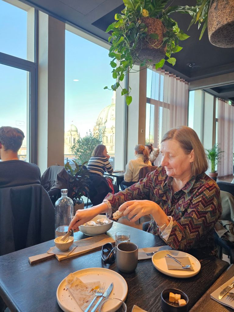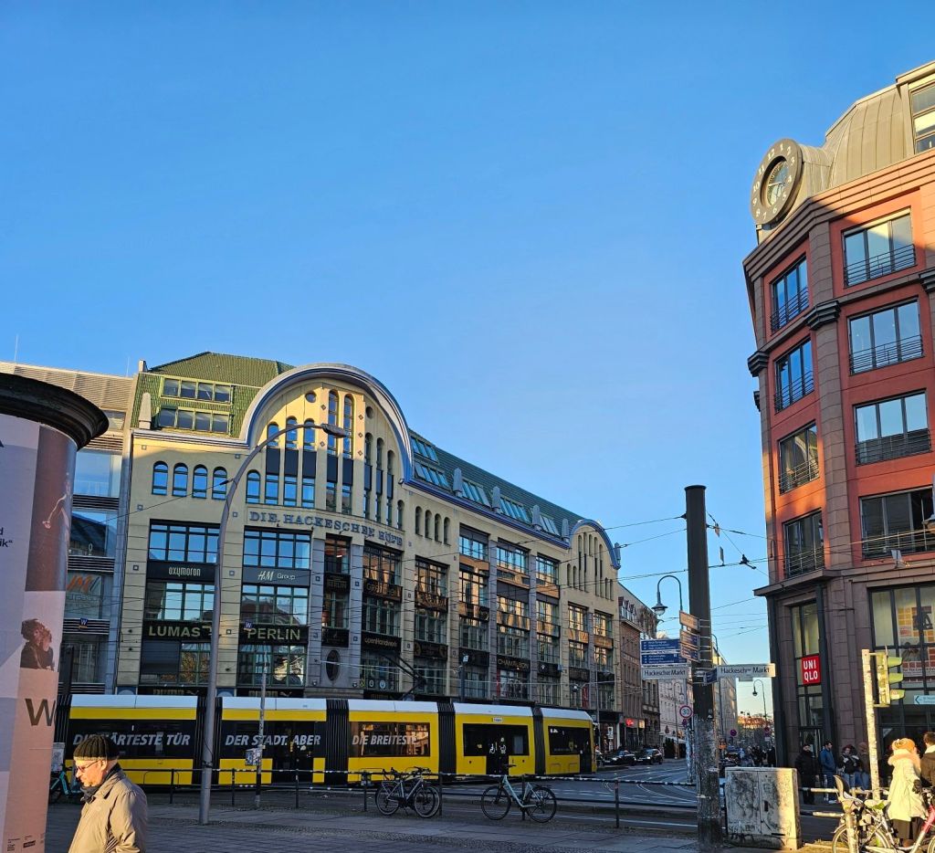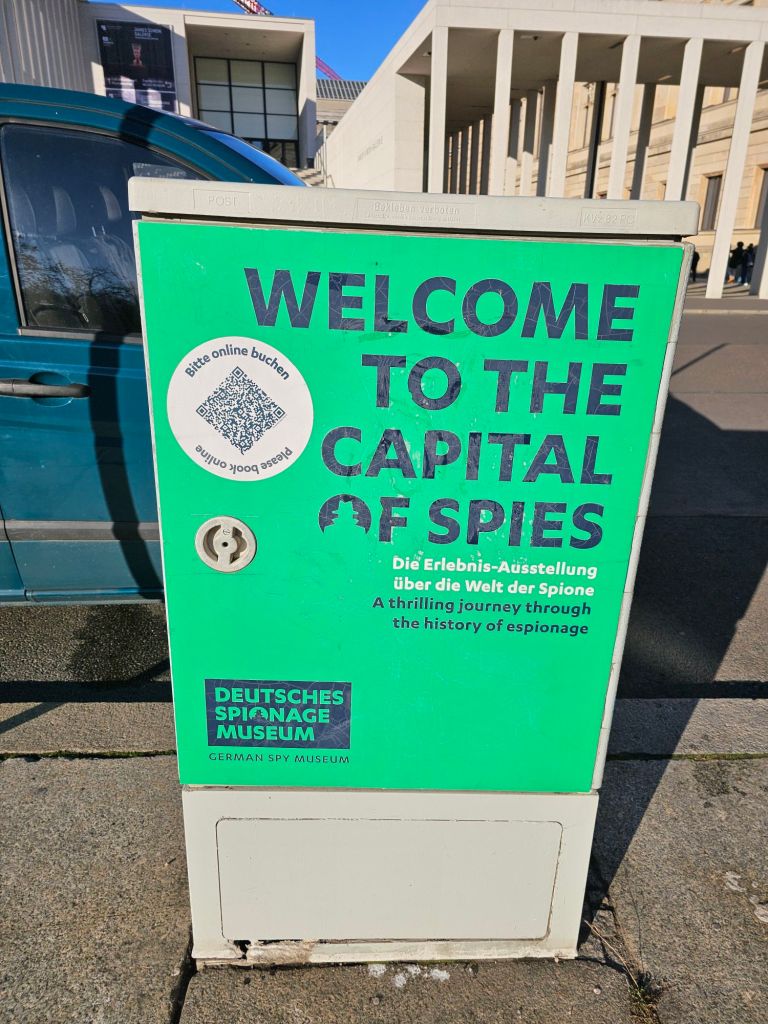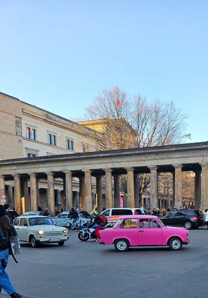 We did not go to the espionage museum, maybe next time. It did look interesting.Berliner Dom was quite imposing.As was the old art gallery.For contrast, here’s Alex outside the new art gallery which is near Potsdamer platz. Quite an unusual building, from a distance the roof appears to be floating as you can see right through the building.I was taken by this rather smart VW.Ulrike took us to a very nice rooftop cafe Baret Berlin, on top of the Humboldt forum art museum. The views were spectacular but so was the food. So much so that we ate it without taking photos. Sorry about that!Here we are on the rooftop balcony.This balloon was having a nice time.The old art gallery from the roof.Berliner DomThe Fernsehturm ( English: Television Tower) in central Berlin was constructed between 1965 and 1969 by the government of the German Democratic Republic, or East Germany, as both a functional broadcasting facility and a symbol of Communist power.We walked to Hackesche Höfe and I was thrilled when we came across a bunch of Trabis much to the amusement of Ulrike and Alex.Walking in East Berlin past the railway station.The Hackesche Höfe is a notable courtyard complex situated adjacent to the Hackescher Markt in the centre of Berlin. The complex consists of eight interconnected courtyards, accessed through a main arched entrance at number 40 Rosenthaler Straße. (Wikipedia)Inside the courtyard There were all sorts of very cool shops.This one was not a venison restaurant oddly enough but it should have been!I was tempted.Instead I bought this model Trabi with Ampelmännchen (literally ‘little traffic light man’) on the doors. Ampelmännchen is the symbol shown on pedestrian signals in East Germany.