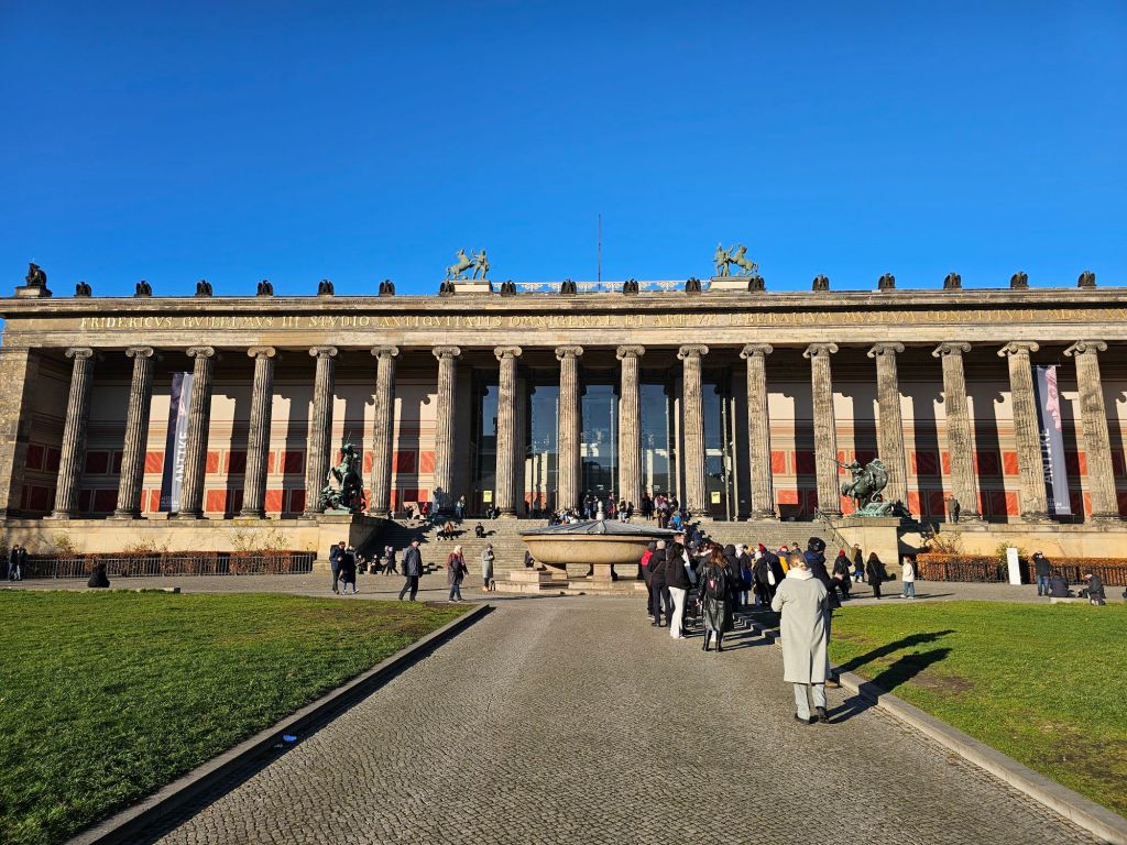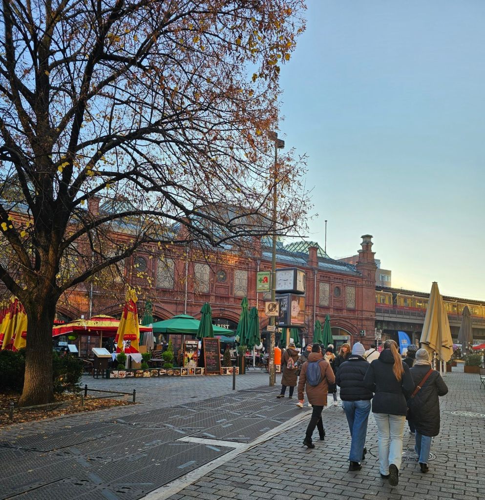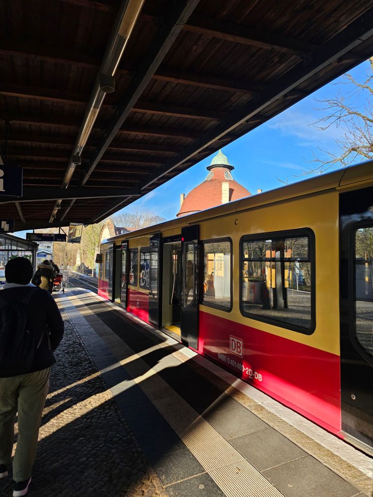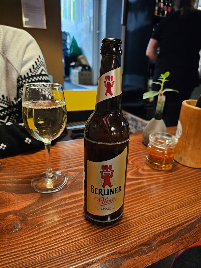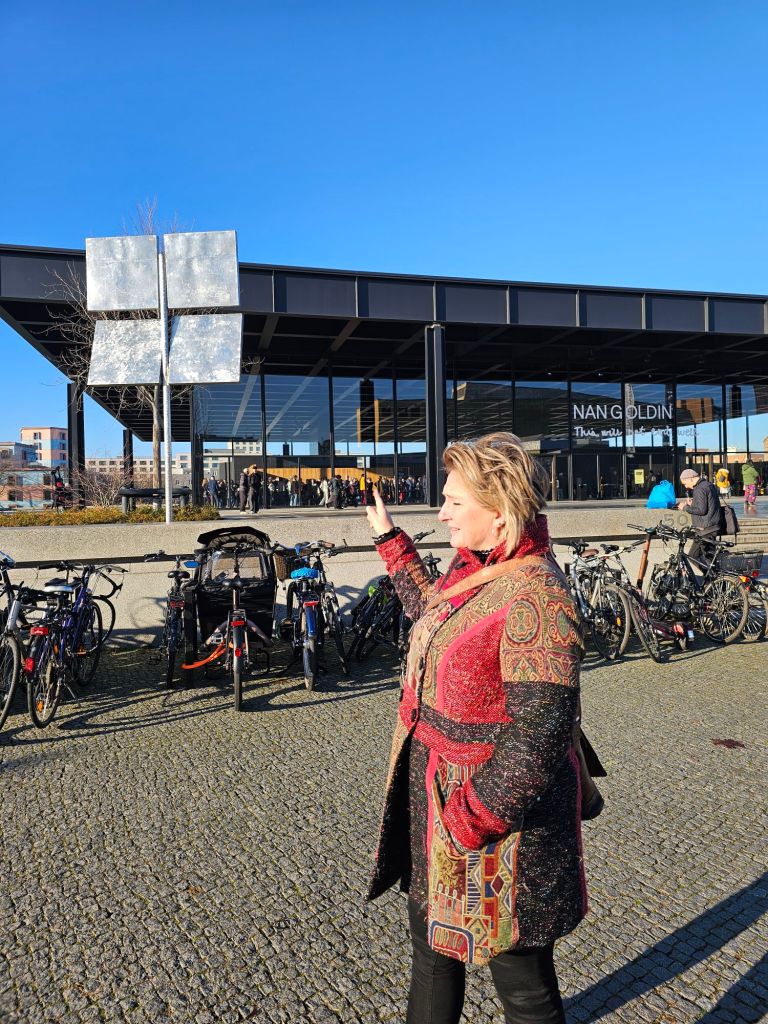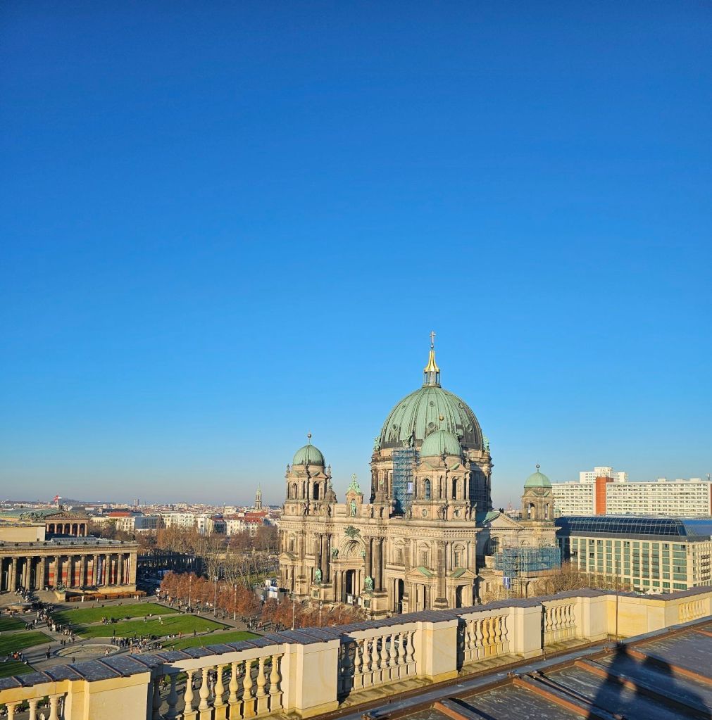We did not go to the espionage museum, maybe next time. It did look interesting.Berliner Dom was quite imposing.As was the old art gallery.For contrast, here’s Alex outside the new art gallery which is near Potsdamer platz. Quite an unusual building, from a distance the roof appears to be floating as you can see right through the building.I was taken by this rather smart VW.Ulrike took us to a very nice rooftop cafe Baret Berlin, on top of the Humboldt forum art museum. The views were spectacular but so was the food. So much so that we ate it without taking photos. Sorry about that!Here we are on the rooftop balcony.This balloon was having a nice time.The old art gallery from the roof.Berliner DomThe Fernsehturm ( English: Television Tower) in central Berlin was constructed between 1965 and 1969 by the government of the German Democratic Republic, or East Germany, as both a functional broadcasting facility and a symbol of Communist power.We walked to Hackesche Höfe and I was thrilled when we came across a bunch of Trabis much to the amusement of Ulrike and Alex.Walking in East Berlin past the railway station.The Hackesche Höfe is a notable courtyard complex situated adjacent to the Hackescher Markt in the centre of Berlin. The complex consists of eight interconnected courtyards, accessed through a main arched entrance at number 40 Rosenthaler Straße. (Wikipedia)Inside the courtyard There were all sorts of very cool shops.This one was not a venison restaurant oddly enough but it should have been!I was tempted.Instead I bought this model Trabi with Ampelmännchen (literally ‘little traffic light man’) on the doors. Ampelmännchen is the symbol shown on pedestrian signals in East Germany.
