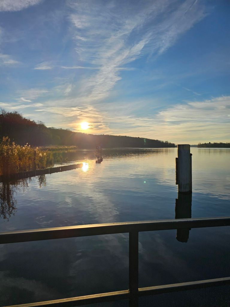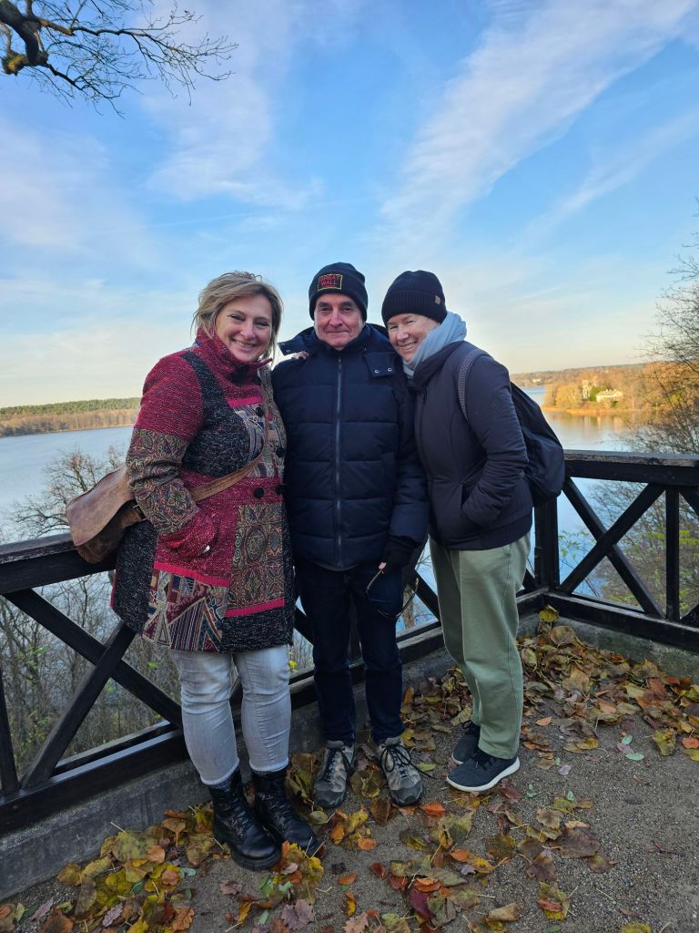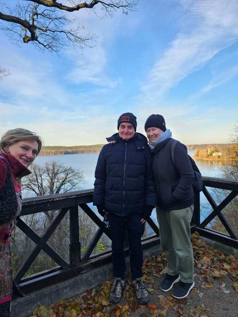 Pauline and our friend Alex at the market, Potsdamer platz.The three of us.S-bahn, Potsdamer platzWe took the s-bahn out to Mexikoplatz to meet Ulrike and JuliaJulia, Pauline, Pod, Ulrike and Alex, Mexikoplatz.Currywurst at Fischerhuette, Schlachtensee for brunch.Alex and UlrikeAlex, Pod and Pauline, NikolskoeForestPark.Same.Ulrike, Nikolskoe Forest Park. Ferry from Nikolskoe Forest Park to Peacock Island.Sunset setting, Wannsee.Roast goose, red and green cabbage, potato dumplings at Blockhaus Nikolskoe. Early Christmas dinner. Very tasty too, neither of us have had goose before.