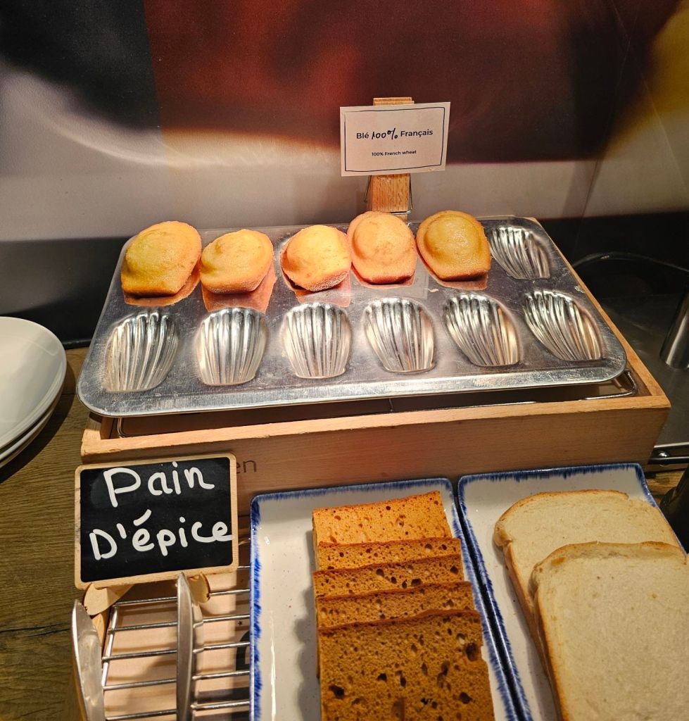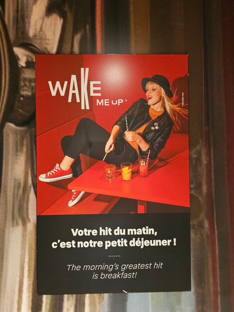 Morning view from our hotel near the Gare de l’est. Grey day but quite a bit warmer than Berlin!The Ibis breakfast was definitely up to scratch, these madelaines were fresh out of the oven. They’re supposed to remind me of something apparently. I thought this poster in the breakfast area was to the point.