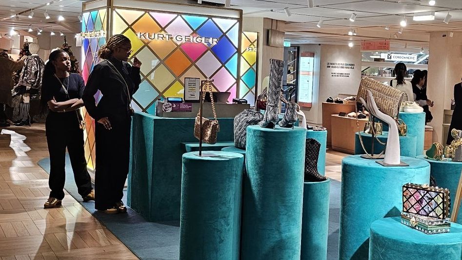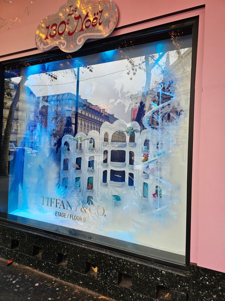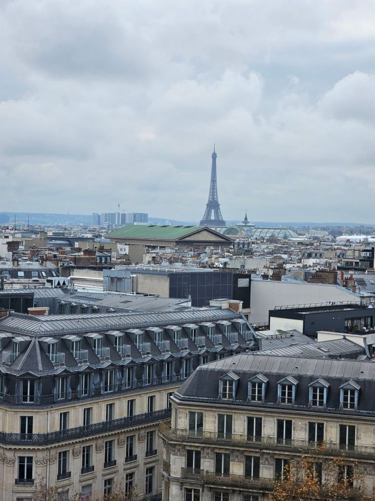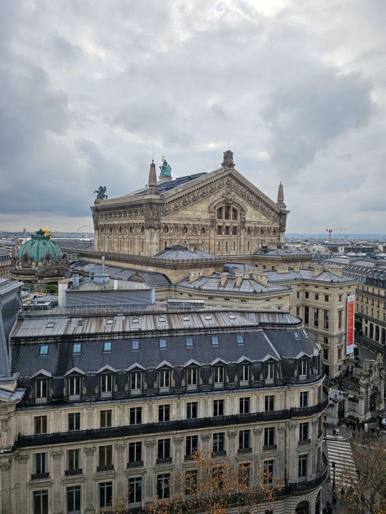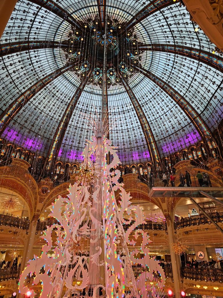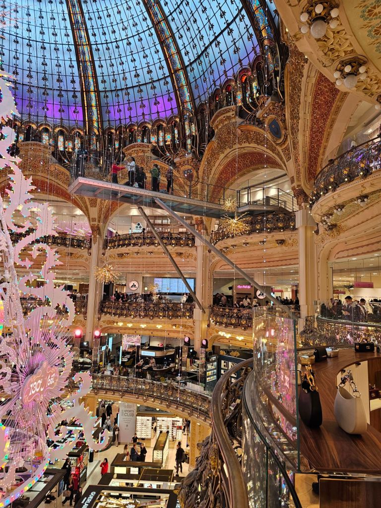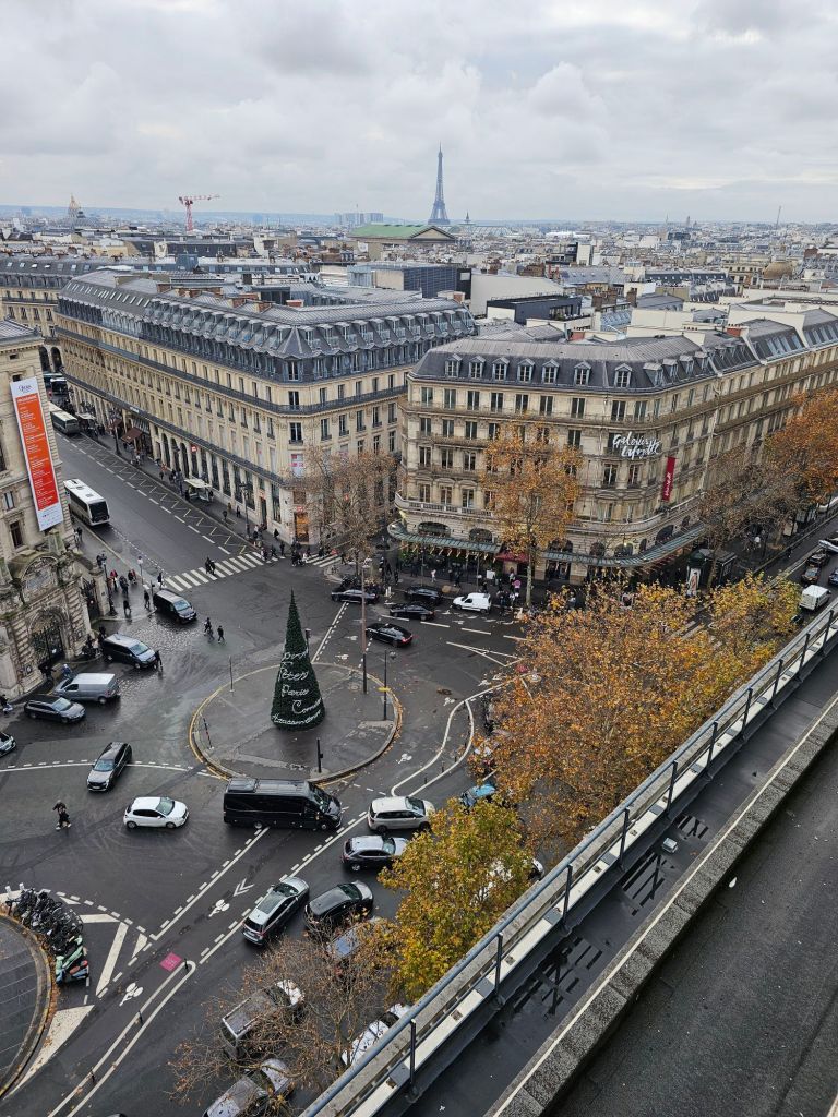 At the foot of the grand staircase. According to Greek mythology, Pythia was the priestess of Apollo, the god of arts, and she delivered the oracles of the god.The grand staircase definitely lives up to its name.A view from the balcony. Inside one of the boxes, the auditorium ceiling.A view of some of the other boxes inside the auditorium.There are busts of famous arty types all around the boxes including this one of Berlioz.Upstairs is the grand foyer, the artist who painted the ceiling wanted to out do the Sistine chapel. It’s spectacular. The ceiling of the grand foyer.Outside, being France there were good natured protests against the government cuts to arts funding. Fair enough too!Pauline’s next plan was to visit this very fancy department store, Galeries Lafayette. They had some Christmas displays in their windows.Inside the decorations are amazing.It’s a bit flasher than even Arthur Barnetts was.They had some amazing boots.We climbed right up to the terrace on the roof, what a view! The Opera in the distance there.Tour Eiffel Paris traffic. Much lighter than it used to be thanks to bicycles and congestion charges!This wonky skyscraper had us intrigued. Built in 2017 apparently. We had to buy some touristy things, everything else cost an arm and a leg, even in the second hand bit.This second hand fur jacket for example, €610! Crikey.