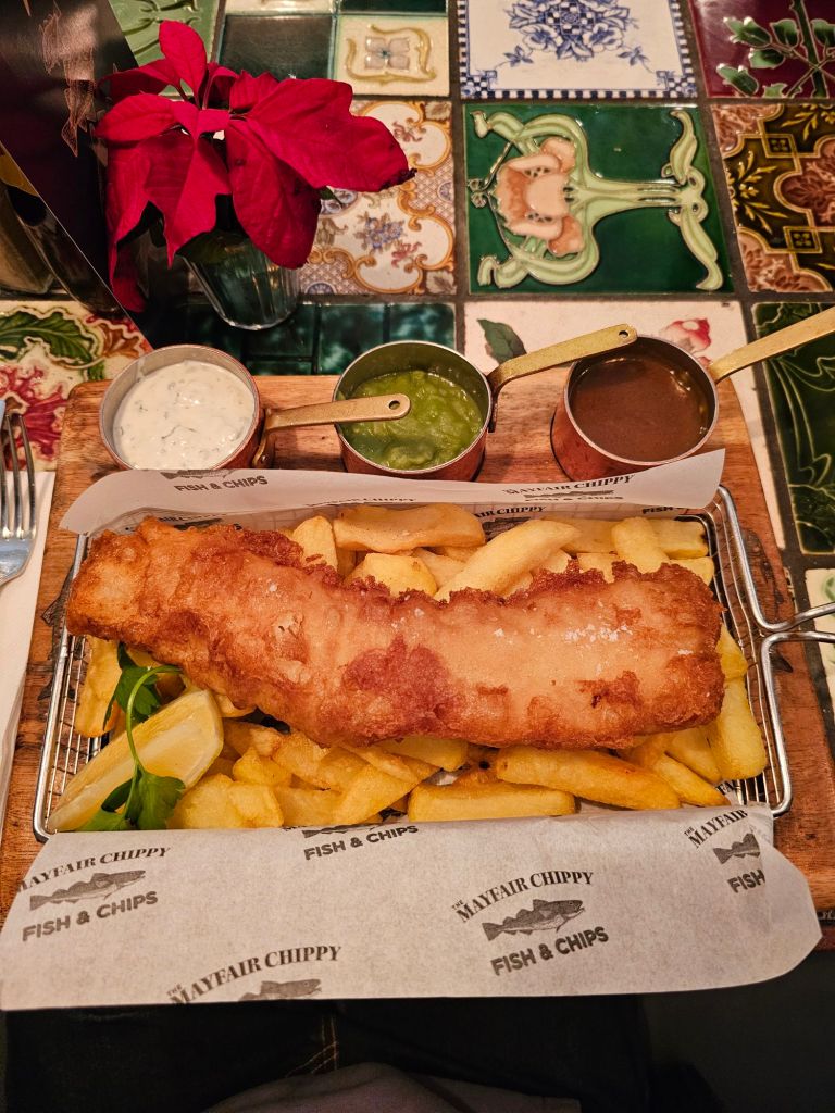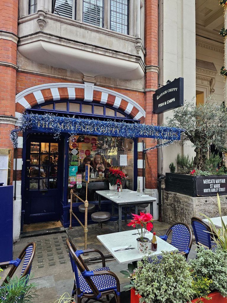 He’s a popular bear is Paddington. At the station on platform 1.On my way to Mayfair I came across him again on this bench.We were watching a TV program called “Secrets of London” and the presenter visited this place. It looked so good I had to try it. Mayfair chippy.Classic cod and chips with tartare sauce, mushy peas and curry sauce.The mushy peas were excellent. As was the cod. Chips were good too.Fortnum & Mason have decorated their windows to look like an advent calendar.I walked past the Lotus showrooms in Picadilly but I didn’t buy one.Walking back through Hyde Park. Kiwis always get excited to see squirrels, presumably because we don’t have them.