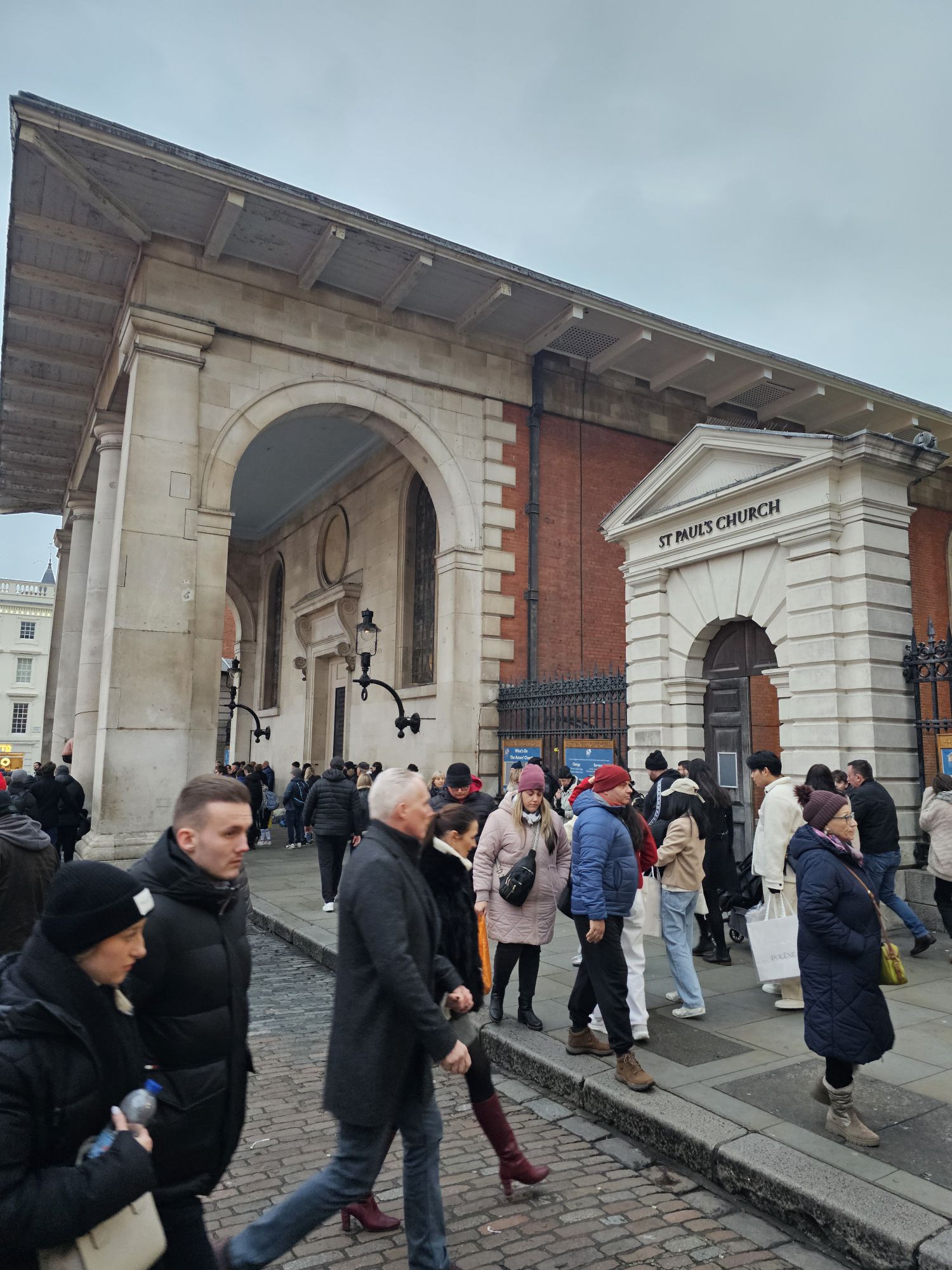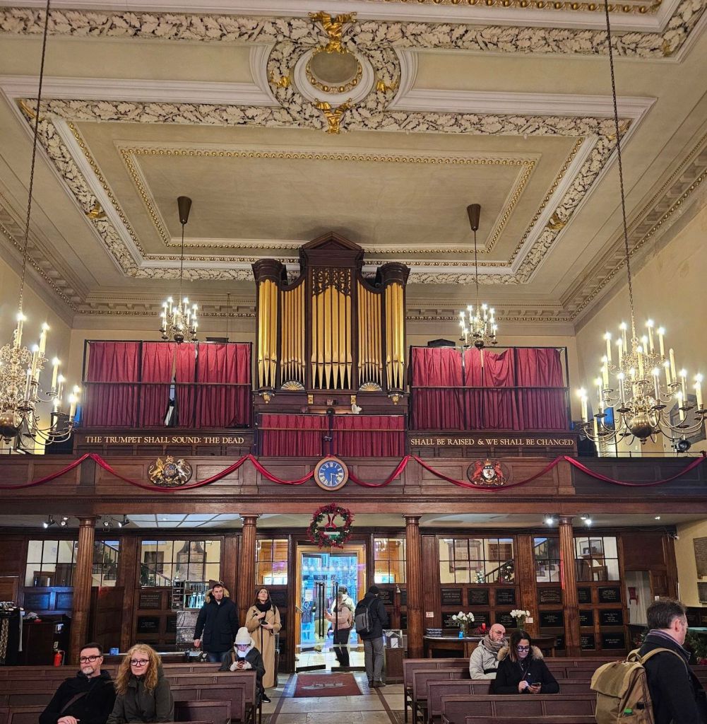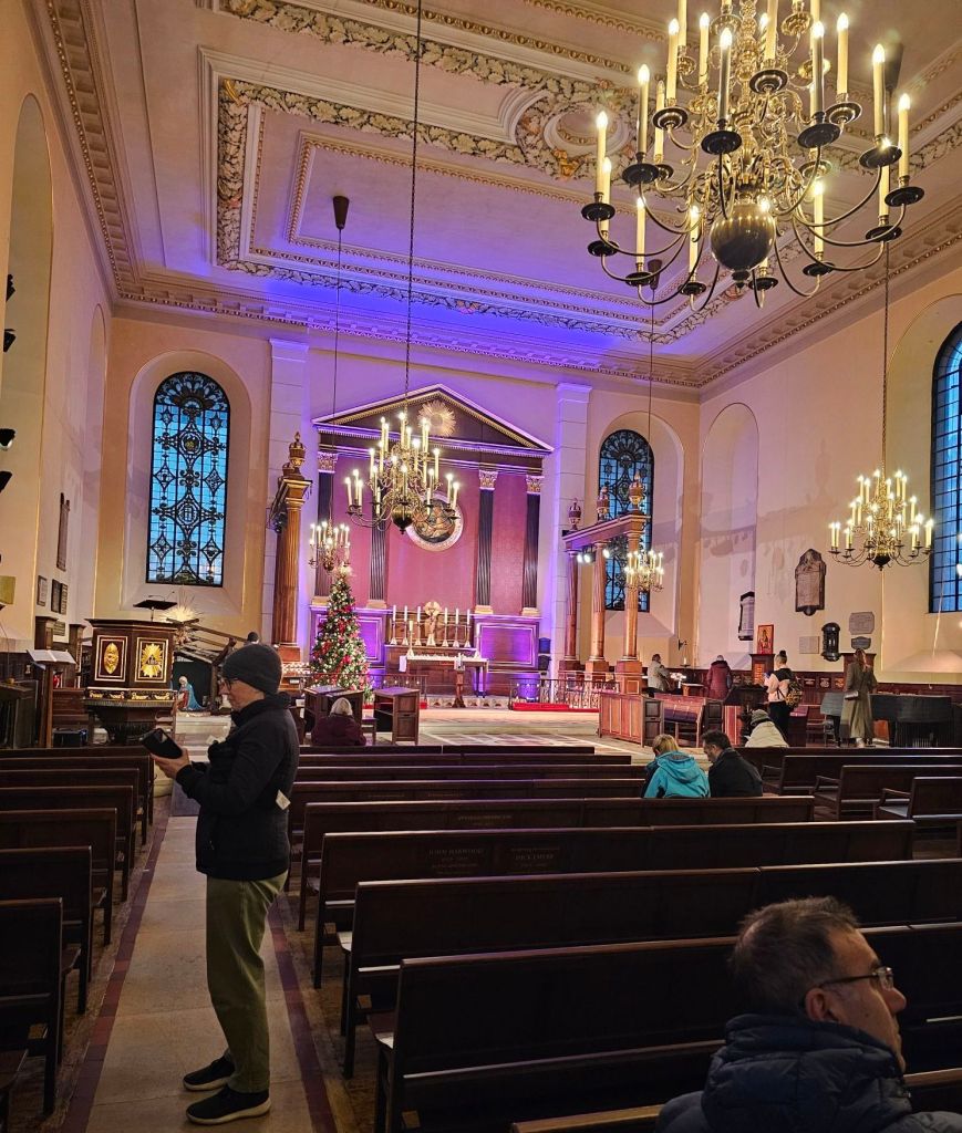 Covent Garden Christmas tree. It’s enormous. Covent Garden market entrance.Inside the market was definitely Christmassy.This is St Paul’s church Covent Garden, also known as the Actor’s Church because it is surrounded by many theatres and it was the church of a lot of actors.Someone was rehearsing the organ while we were here. Very nice too.Quite a simple church inside, well it is C of E.There are some memorials to some pretty famous actors inside the church.Noël Coward and Charlie Chaplin for example!Quite a few of the “Carry on” actors. The young American woman on our tour had no idea who they were of course.Neal’s yard, seven dials. Monty Python had an animation production office here in the ’70s.The streets are beautifully decorated around here.Seven dials.