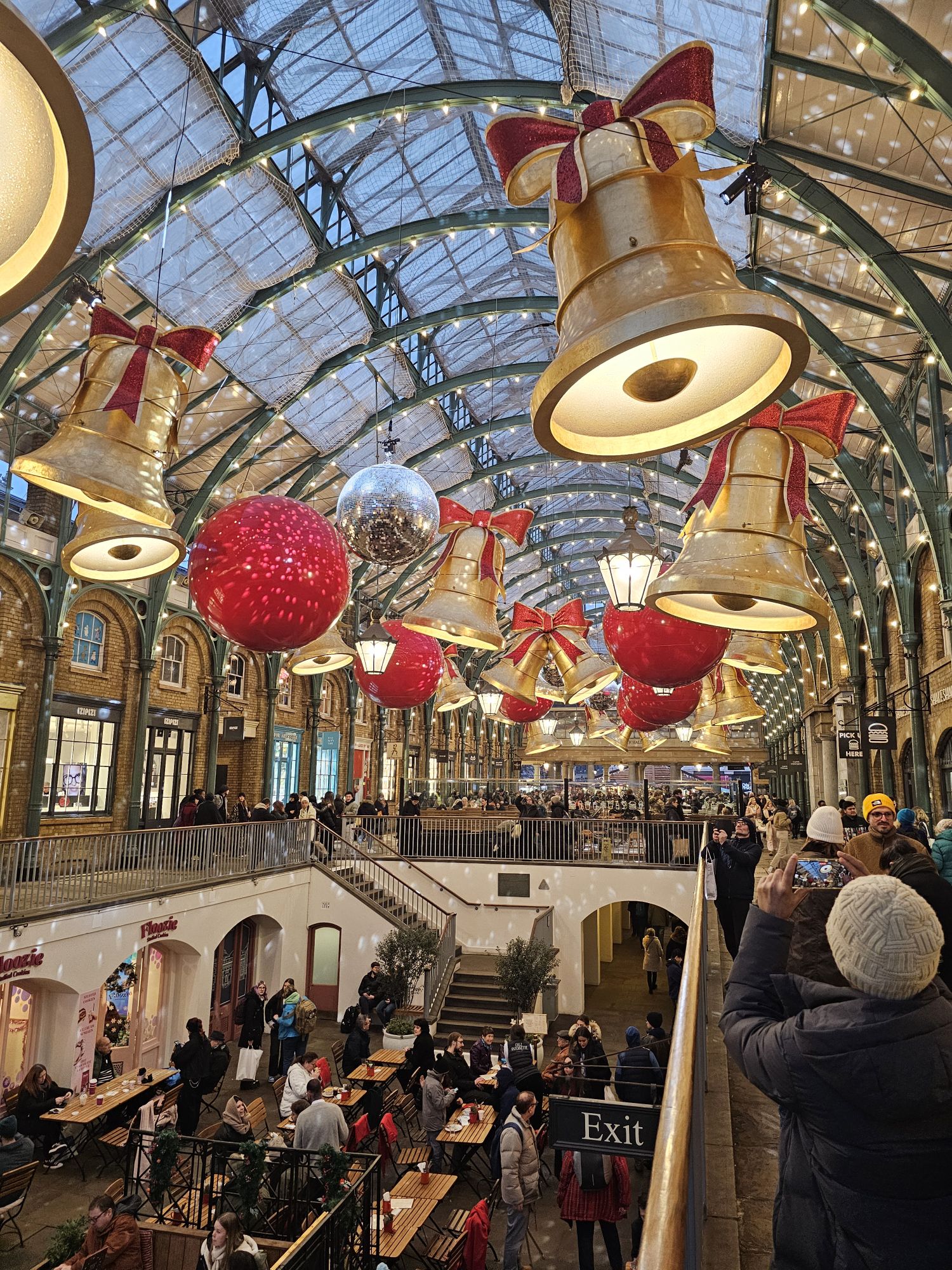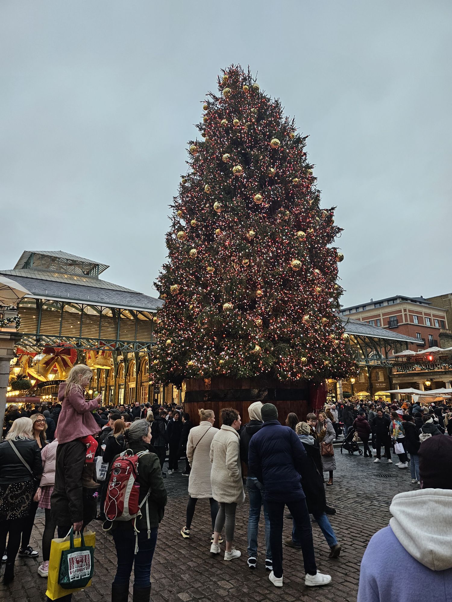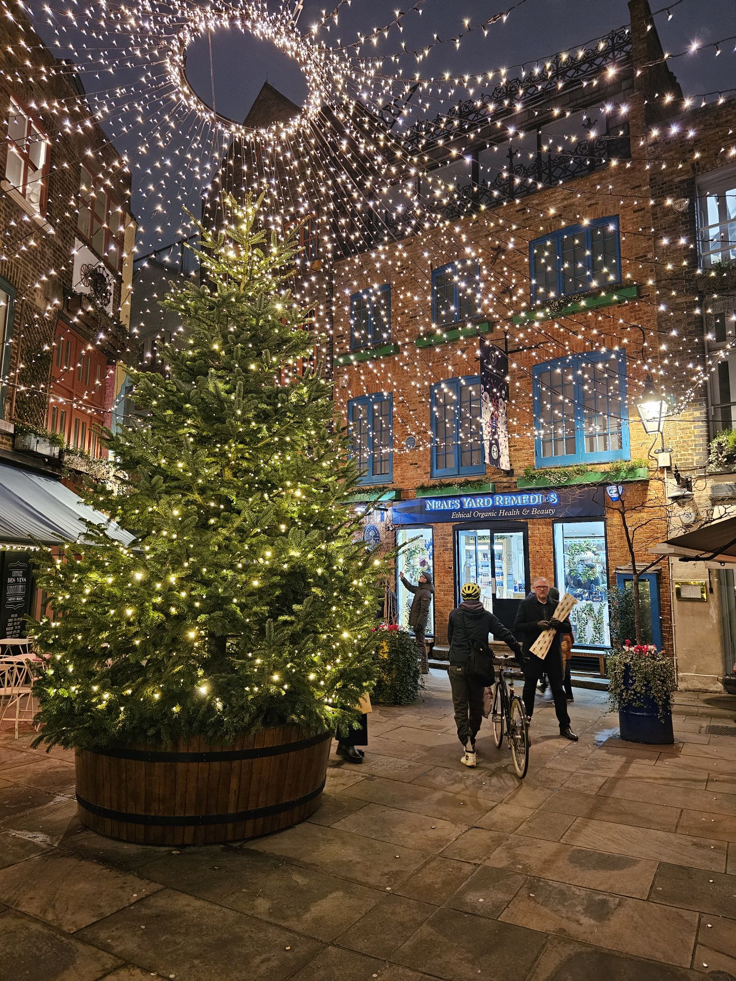 Covent Garden Christmas tree. It’s enormous. Covent Garden market entrance.Inside the market was definitely Christmassy.This is St Paul’s church Covent Garden, also known as the Actor’s Church because it is surrounded by many theatres and it was the church of a lot of actors.Someone was rehearsing the organ while we were here. Very nice too.Quite a simple church inside, well it is C of E.There are some memorials to some pretty famous actors inside the church.Noël Coward and Charlie Chaplin for example!Quite a few of the “Carry on” actors. The young American woman on our tour had no idea who they were of course.Neal’s yard, seven dials. Monty Python had an animation production office here in the ’70s.The streets are beautifully decorated around here.Seven dials.