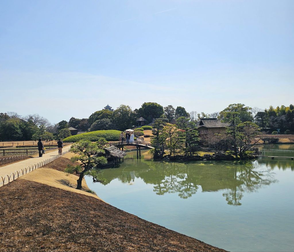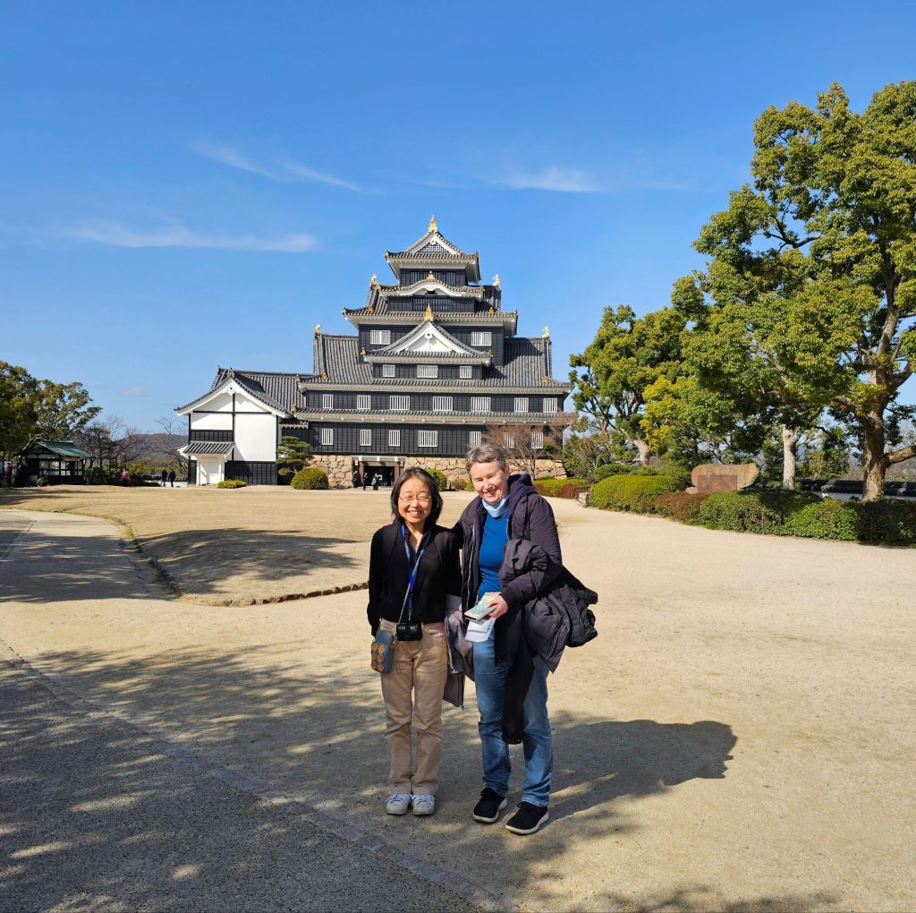 Mihoko was a PhD student in the Pharmacy School when I was working there and also when Pauline was there, we both got on well with her. We thought it would be great to catch up since she’d been back in Japan about twelve years or so now. So we took the fast train to Okayama and she met us at the station. We dropped our luggage at the hotel and took a taxi to the Okayama Korakuen Gardens which were quite stunning. From Wikipedia: “Kōraku-en is a Japanese garden located in Okayama, Okayama Prefecture. It is one of the Three Great Gardens of Japan, along with Kenroku-en and Kairaku-en. Korakuen was built in 1700 by Ikeda Tsunamasa, lord of Okayama. The garden reached its modern form in 1863.”
