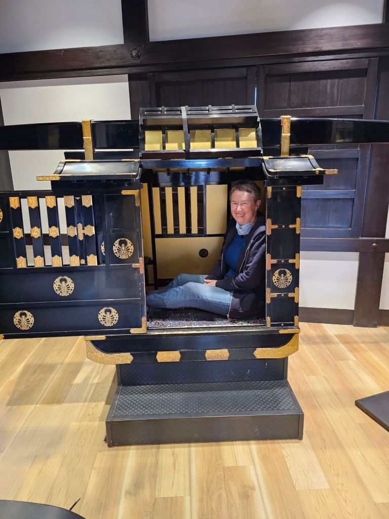 Mihoko and Pauline, Castle.Samurai from the Shogun era.Pauline in palanquin inside the castleView from the top floor.