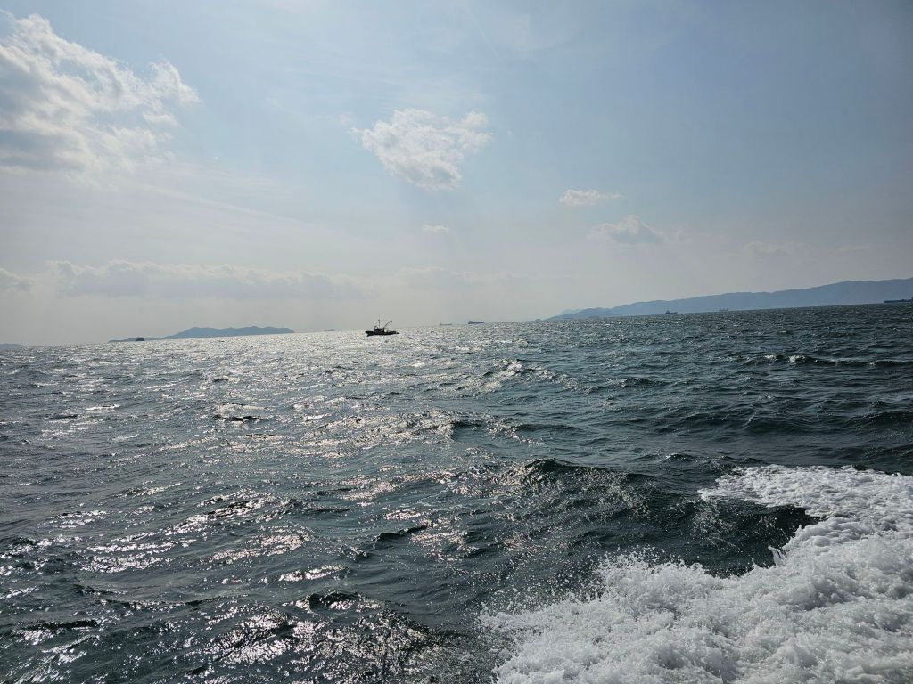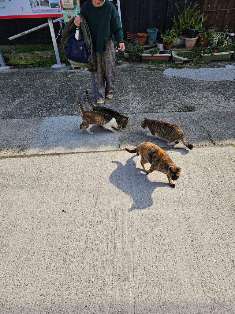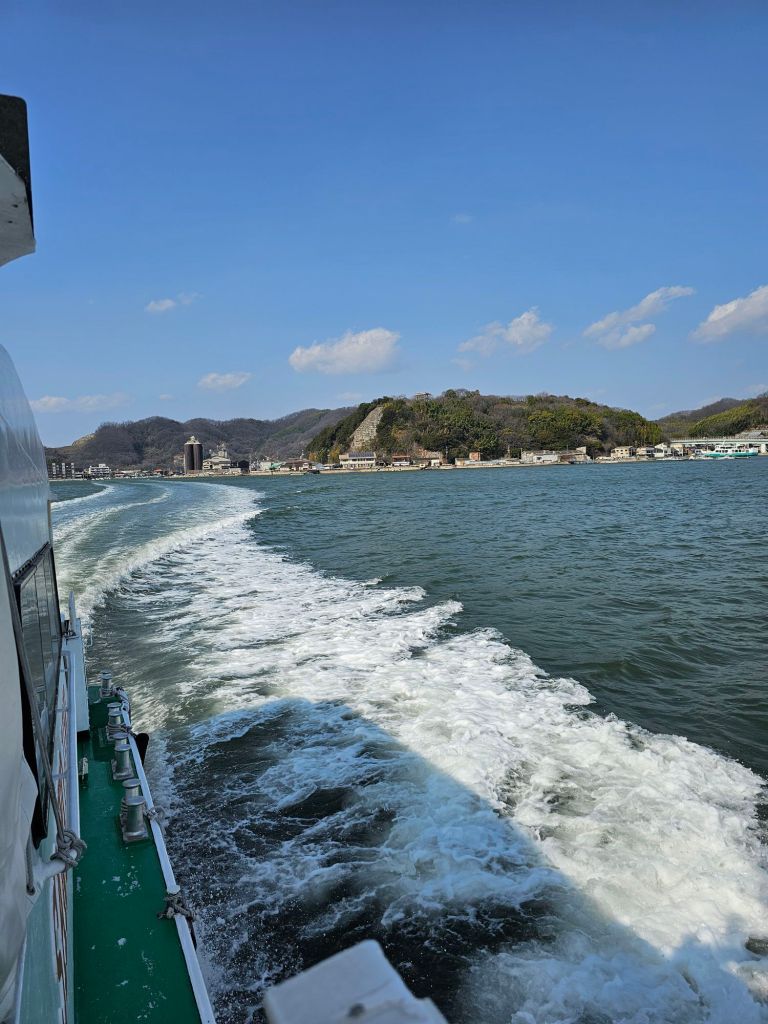 The most famous cat island in Japan is Aoshima but we were unlikely to be heading that way so I searched for one near Okayama and found Manabe island, and it sounded like a good excuse to do a spot of boating so we decided to visit on the way to Fukuoka, making it quite a big day but why not? The previous day we’d had a lazy day as it was raining, we went to the post office and mailed some stuff back home like our bento boxes, save us carrying them all round the world. The post office reminded me of the old NZPO, the people were lovely and extremely helpful but they didn’t speak any English so we had a bit of fun getting it all sorted. Anyway, this morning we started out fairly early and jumped on the fast train to Fukuyama and stashed our luggage there, then took a local train to Kasaoka where the ferry leaves to Manabe. Kasaoka was a charming little town, we bought sandwiches and ate them in the square next to a memorial to an 800 year old war. The ferry was awesome, it reminded me a bit of a torpedo boat and it certainly honked along.