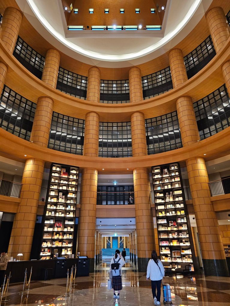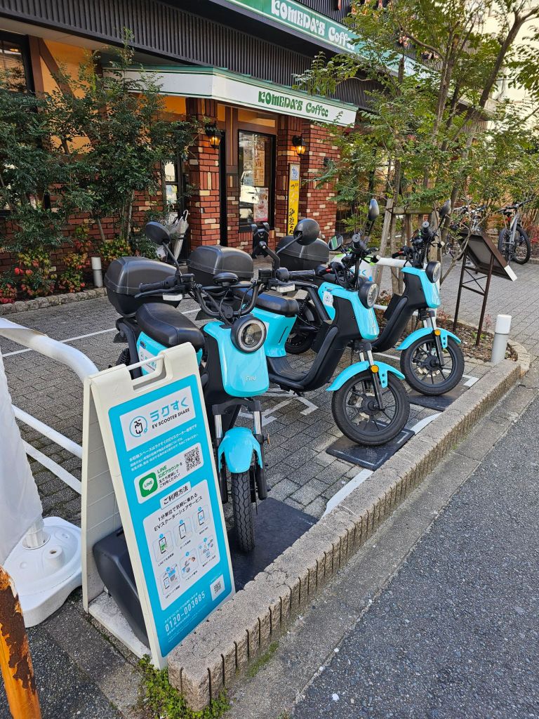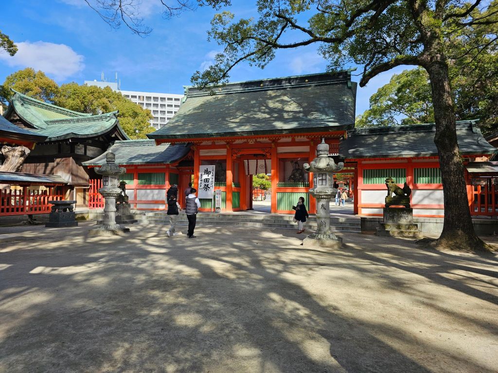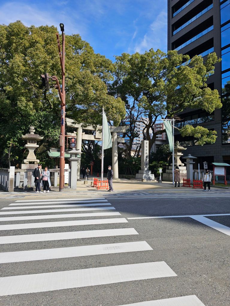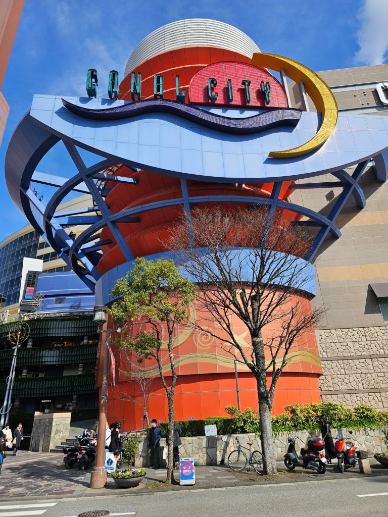 Downtown, with invisible ducksThere is a canal and “canal city” is a tourist attraction so we thought it might be something like Venice but alas, it was an enormous shopping mall!This shrine was also a working temple I thinkI liked these EV scooter share scooters, great idea.The entrance to our hotel. It’s certainly quite impressive.